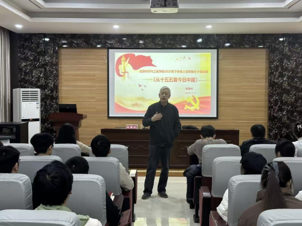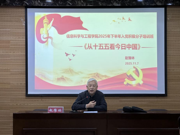 2025年11月7日,为引导青年学子把握国家发展大势,明确时代责任,河南工业大学原副校长、校关工委主任赵豫林以《从十五五看今日中国》为题,为学校新入党积极分子讲授专题党课,以深厚阅历与专业视角,深入浅出引导青年读懂中国、认同制度、勇担使命。