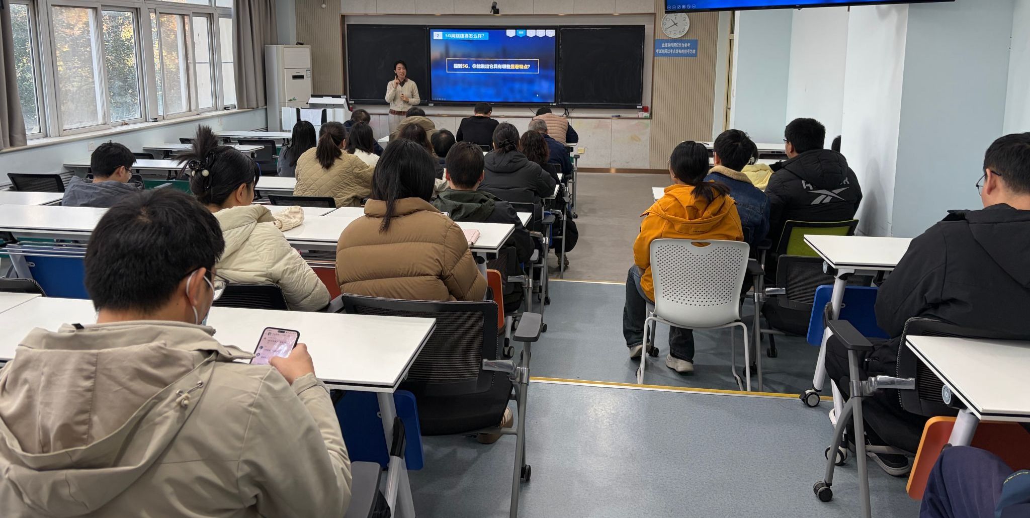 本次示范课以“5G技术及应用”为教学内容,马海华老师凭借扎实的专业功底与丰富的教学经验,构建了“知识传授—思维引导—价值塑造”三位一体的课堂体系。授课中,她以清晰的逻辑层次串联知识点,通过精美直观的PPT、行业前沿视频等教学资源,将抽象的5G技术原理转化为可感知的学习内容;借助“问题链导入—小组讨论—学习通在线答题”等多元化互动形式,充分落实“教师主导、学生主体”的教学理念,让现场观摩教师沉浸式体验高效课堂的构建方法。尤为突出的是,马老师将课程思政元素与专业知识深度融合,结合我国5G产业发展的重大突破,自然融入“科技报国”的价值引领,使思政教育真正实现“入脑润心”,为在场教师提供了“课程思政落地”的鲜活范本。