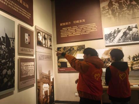 (a)抗日战争厅入口 (b)队员参观学习场景