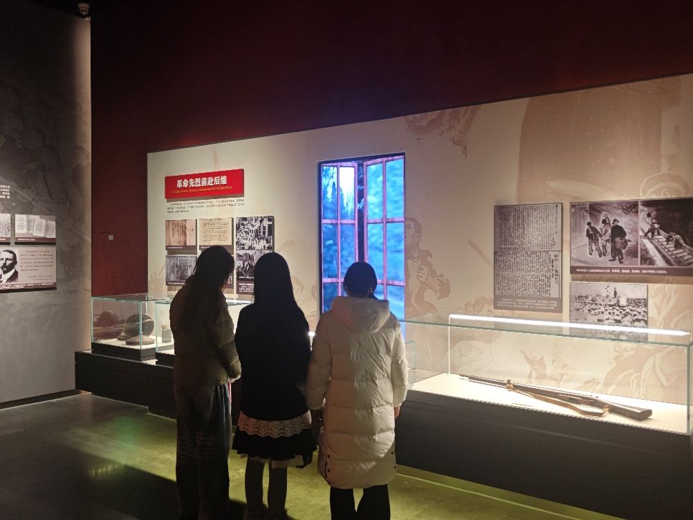 1月28日上午,实践团首站抵达中原英烈纪念馆。作为河南省爱国主义教育示范基地,该馆以实物、图片、文字及声光电等现代化手段,完整呈现了中原人民四十余年的革命斗争历程。在一层展厅,队员们驻足于12根浮雕柱前,认真体会“五四运动在开封”“郑州二七大罢工”等历史场景,泛黄的文献资料、斑驳的革命实物,将大家带回风雨如晦的革命年代。锈迹斑斑的梭镖、记载起义历程的史料,让队员们深切感受革命先辈为理想挺身而出的坚毅。