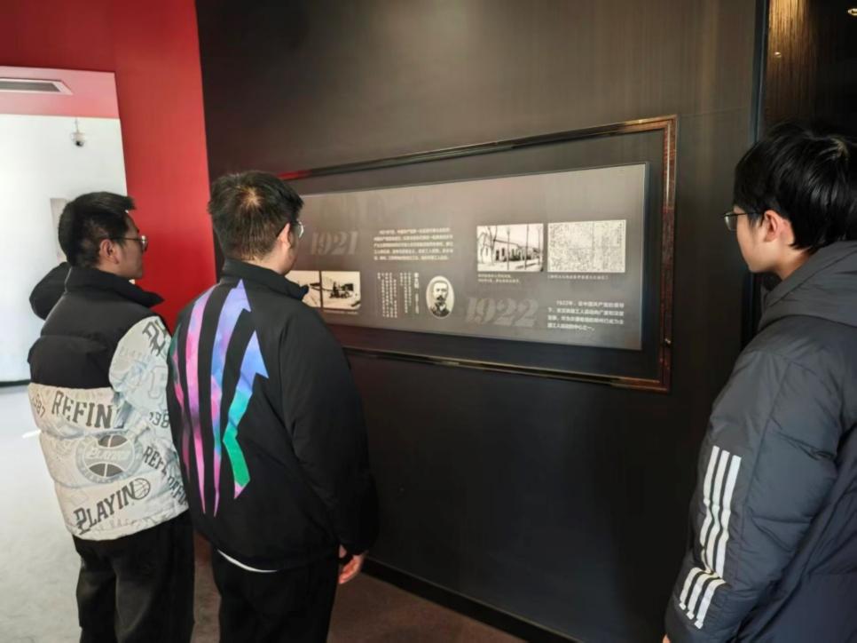 步入展厅,团员们迅速投入到自主研学中。在“1921-1922”历史展板前,几位同学驻足凝视,仔细研读京汉铁路总工会筹备的历史细节;在“英勇抗争”展区,团员们指着展板上的黑白史料,交流着二七大罢工爆发时的悲壮场景;当看到团员李同学指着展板上的历史照片讲解时,周围同学纷纷围拢,在互动中深化对历史的理解。