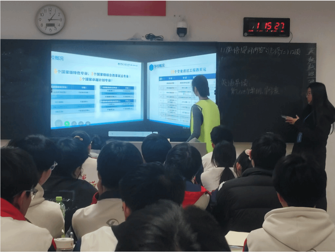在班级宣讲环节,团队成员马子扬马淑倩以PPT为载体,系统介绍河南工业大学办学历史与学科优势。内容涵盖学校六十余年发展历程、国家级一流本科专业建设点、产学研合作成果等。讲解过程中,团队成员穿插展示校园风光影像与学生自主研发的创新项目案例,并对比分析信息类专业与人工智能类专业的课程差异,帮助学生理解不同专业的培养侧重。