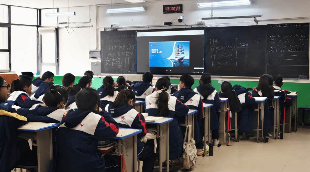 2026年2月6日下午1时10分,团队成员进入高一34班教室,播放河南工业大学宣传片。影片展示学校图书馆、实验室、体育馆等硬件设施,以及学生参与学科竞赛、社团活动的场景。播放结束后,团队成员孙露涵结合PPT补充介绍学校"明德求是,拓新笃行"的校训内涵,并重点说明在线赌场