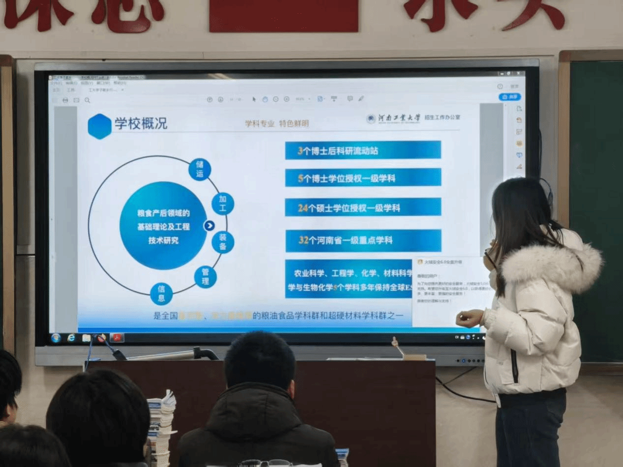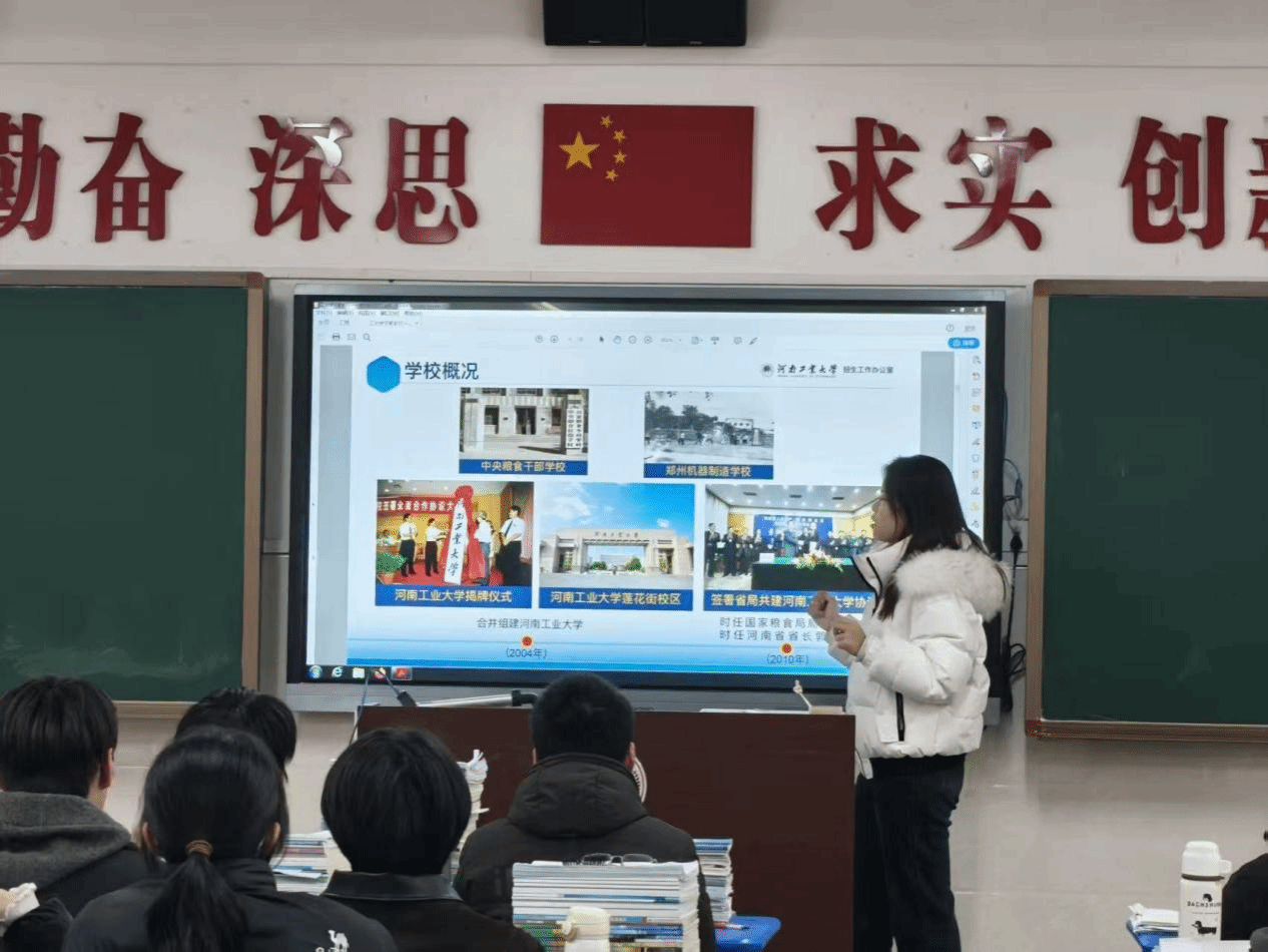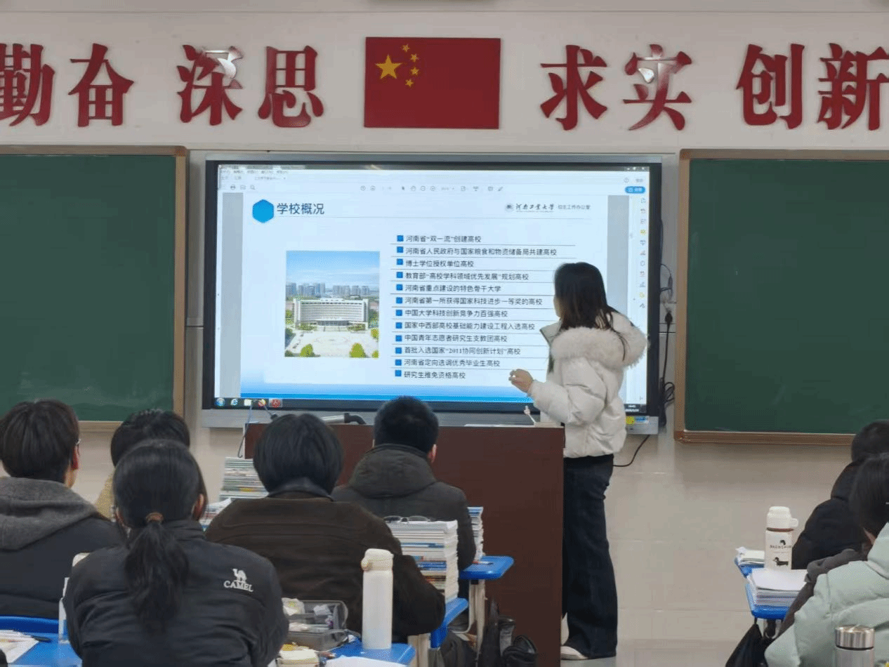 宣讲开篇,团队成员以学校历史沿革为切入点,通过展示印有发展脉络的 PPT,详细讲解:“河南工业大学始建于 1956 年,前身涵盖中央粮食干部学校、郑州机器制造学校等,2004 年正式合并组建,2010 年签署省局共建协议,现已发展为涵盖九大学科门类的多科性全日制公办高校,拥有完整的学士、硕士、博士三级人才培养体系。” 清晰的时间轴让学子们直观感受学校的深厚底蕴。