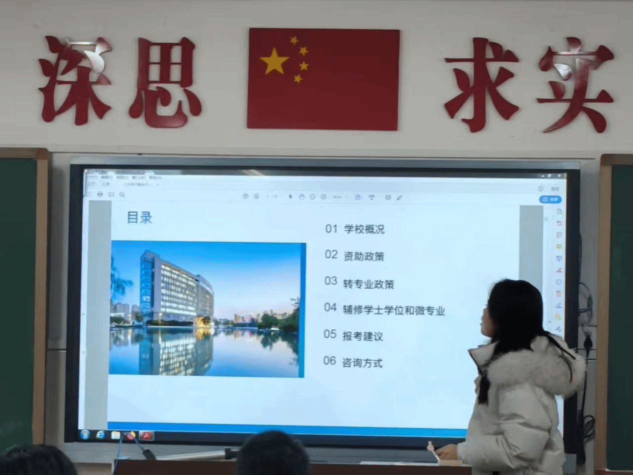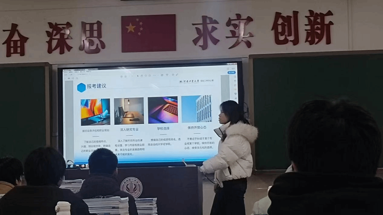 宣讲尾声,团队依托报考建议 PPT,从 “自我评估与职业规划”“深入研究专业”“科学选择学校”“保持开放心态” 四个维度,结合自身经历分享实操经验。互动环节中,学子们围绕政策细节、报考流程等问题提问,团队成员逐一耐心解答,并留下咨询联系方式。